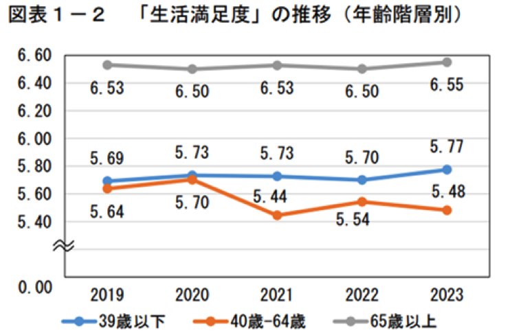 日本でも、内閣府の「満足度・生活の質に関する調査報告書2023」によれば、下表のとおり、高齢者層(65歳~89歳)で最も生活満足度が高く、ミドル層(40~64歳)で最も低いという傾向が確認されています。高齢になって、デンマークの「ヤンテの掟」が言うように、自分の身の丈をわきまえるようになれば、幸福度は向上するのではないでしょうか? わたし自身のつたない経験からしても、まさにその通りではないかという気がしますが、皆さんは如何でしょうか?